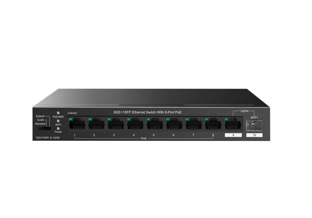 Tenda TEG1110PF-8-120W PoE+ AT switch 8xPoE 802.3af/at + Uplink RJ45 + SFP port, 110W, PoE+, fanless
