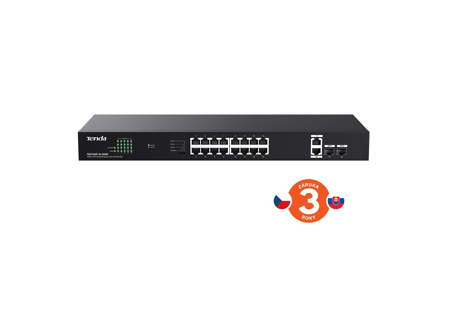 Tenda TEG1120P-16-250W obsahuje přepínač pro výběr ze čtyř režimů: CCTV / Standart / VLAN / Extend mode.
