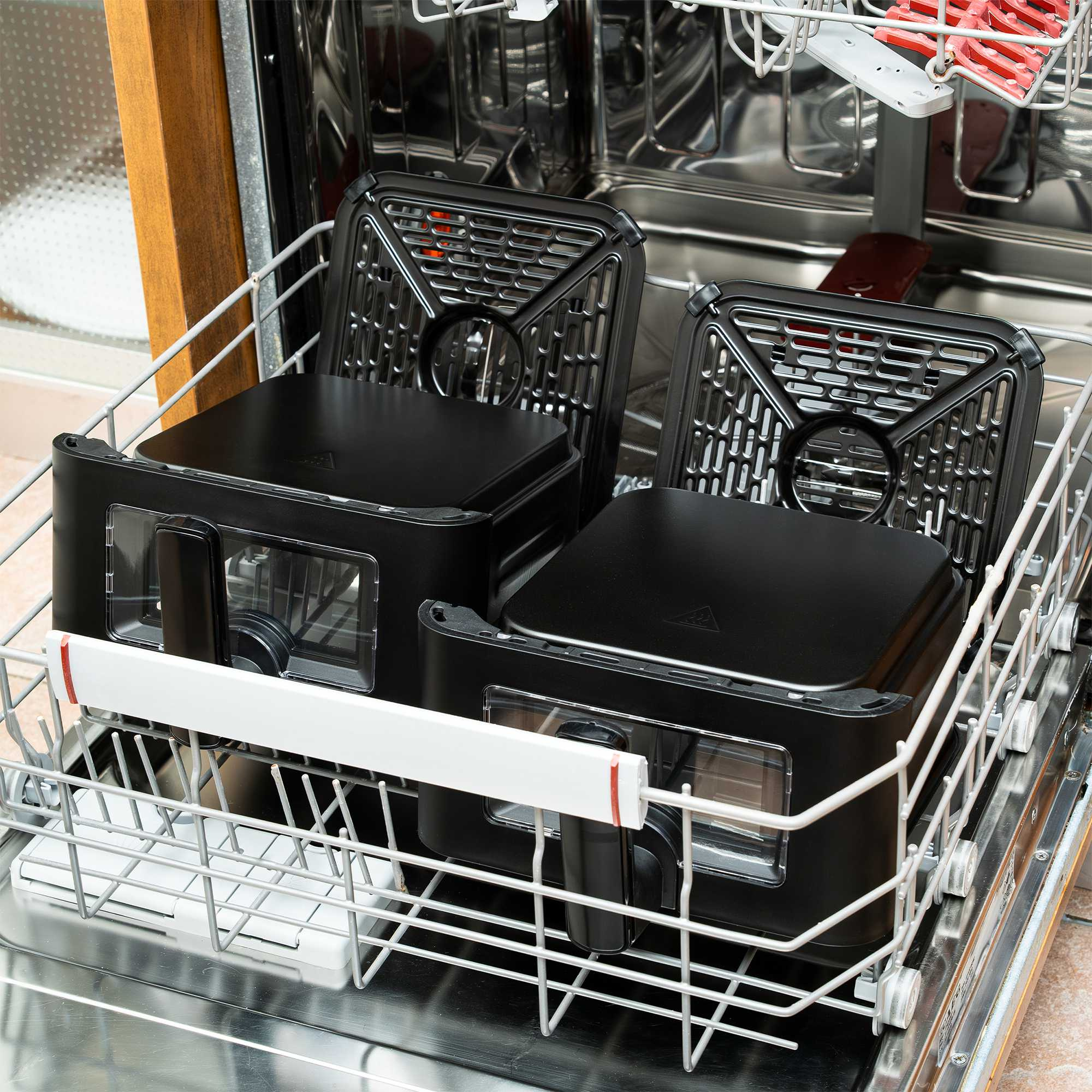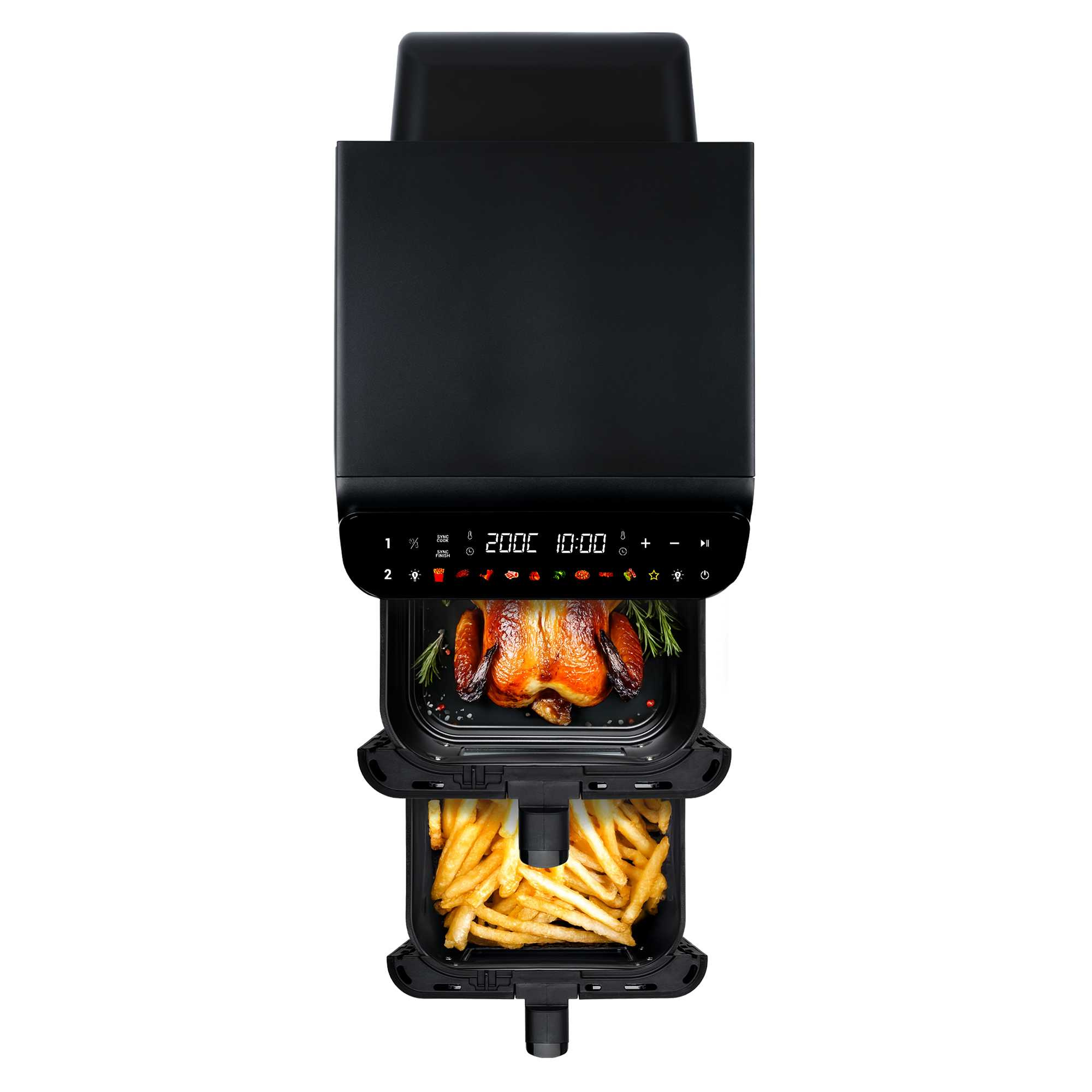 Multifunkční horkovzdušná fritéza s dvěma prostornými koši o objemu 5,5 litru umožňuje připravit více pokrmů současně. Každý koš je vybaven průzorovým okénkem a osvětlením, takže lze snadno sledovat průběh vaření bez nutnosti otevírání.