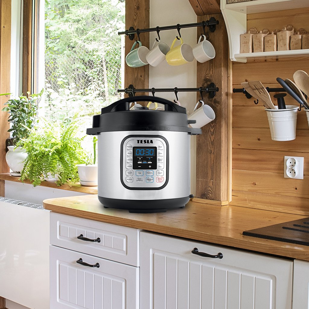 S multifunkčním elektrickým tlakovým hrncem TESLA EliteCook K70 můžete vařit pod tlakem, vyrobit si vlastní jogurt, vařit na páře, využít pomalé vaření nebo odložený start nebo si pochutnat například na klasickém vývaru, guláši, hovězí/vepřové pečeni, kuřeti, chilli, těstovinách, masových kuličkách, zelí, perkeltu, bramborách, rýži, luštěninách a dalších - podobně jako v klasickém tlakovém hrnci.