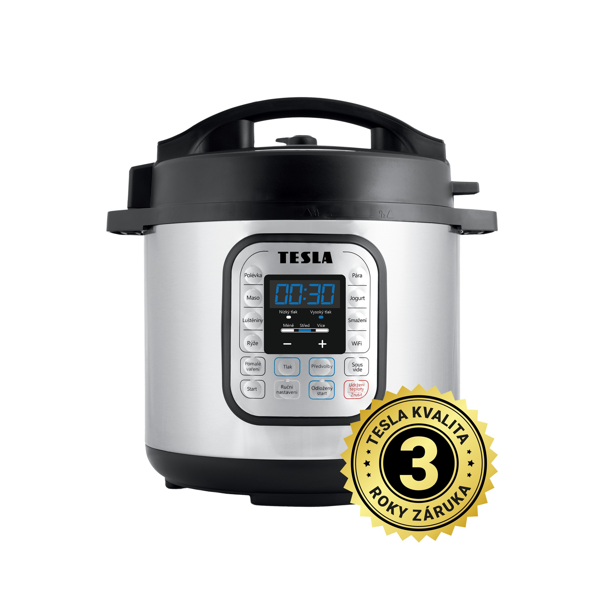 Moderní mikroprocesor monitoruje vnitřní tlak i teplotu a nastavuje intenzitu ohřevu po celou dobu vaření. Tlakový hrnec TESLA je vybaven množstvím bezpečnostních prvků, včetně bezpečnostního systému uzamykání poklice, který umožní vytvářet tlak pouze tehdy, když je tlakový hrnec bezpečně uzavřen a nedovolí jeho otevření, dokud není tlak uvnitř tlakového hrnce snížen na bezpečnou hodnotu. Délku vaření a volbu tlaku můžete upravit sami dle vašich potřeb.