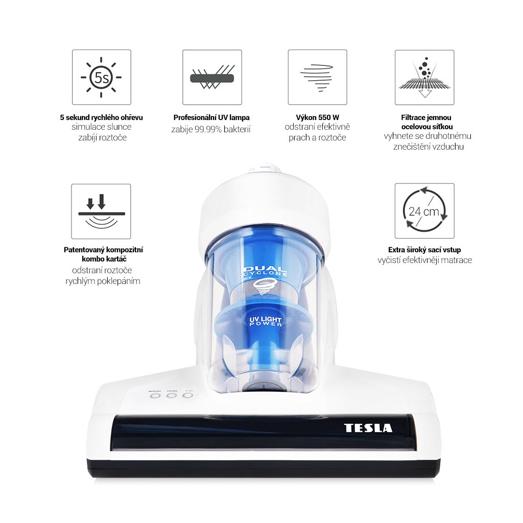 TESLA LifeStar UV550 si při čištění poradí s hluboko usazeným prachem, zvířecími chlupy a jinými nečistotami. Výkonná UV-C lampa a horký vzduch zničí 99.9% bakterií, alergenů a roztočů, sterilizuje matrace, polštáře, čalounění, snižuje riziko vzniku astmatu a kožních onemocnění. Rotační turbo kartáč pronikne hluboko do vláken textilu a efektivně odstraní nežádoucí mikroorganismy.