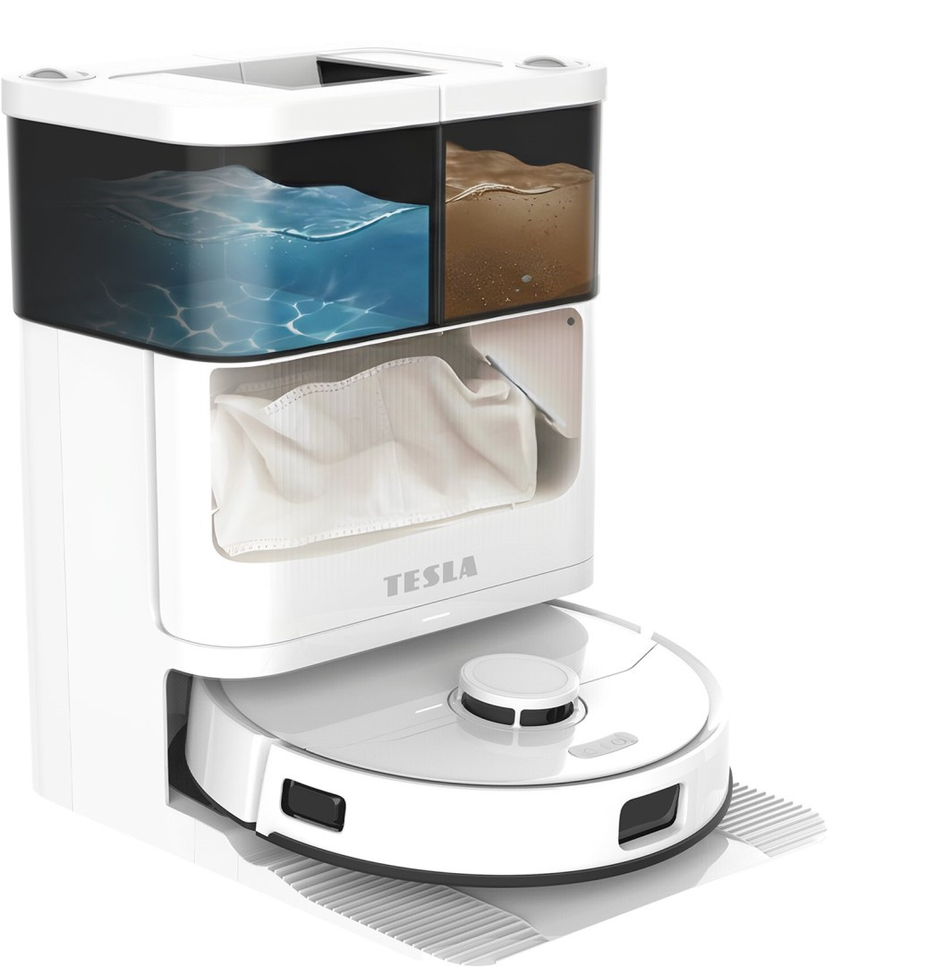 Multifunkční stanice TESLA RoboStar iQ900 Ultra provádí kompletní údržbu robotického vysavače zcela samostatně. Automaticky doplňuje vodu, pere mopy v teplé vodě s čisticím prostředkem a následně je suší horkým vzduchem pro zachování maximální čistoty a hygieny. Velké oddělené zásobníky na čistou a znečištěnou vodu zajišťují provoz bez nutnosti časté obsluhy. Prach a nečistoty se automaticky odsávají ze zásobníku vysavače do stanice, která zároveň odčerpává použitou vodu a doplňuje novou. Horkovzdušné sušení eliminuje vlhkost, plísně i zápach, zatímco nabíjecí systém udržuje zařízení neustále připravené k provozu.