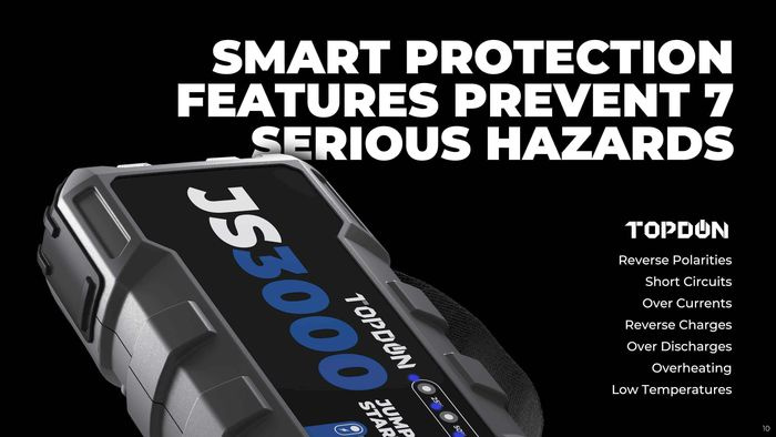 Celkem 6 elektronických ochran zajistí bezpečnost Vašeho přístroje, startovacího zdroje JumpSurge 3000, i Vašeho vozidla. Vše na základě předpisů CE a EU. Buďte v bezpečí.