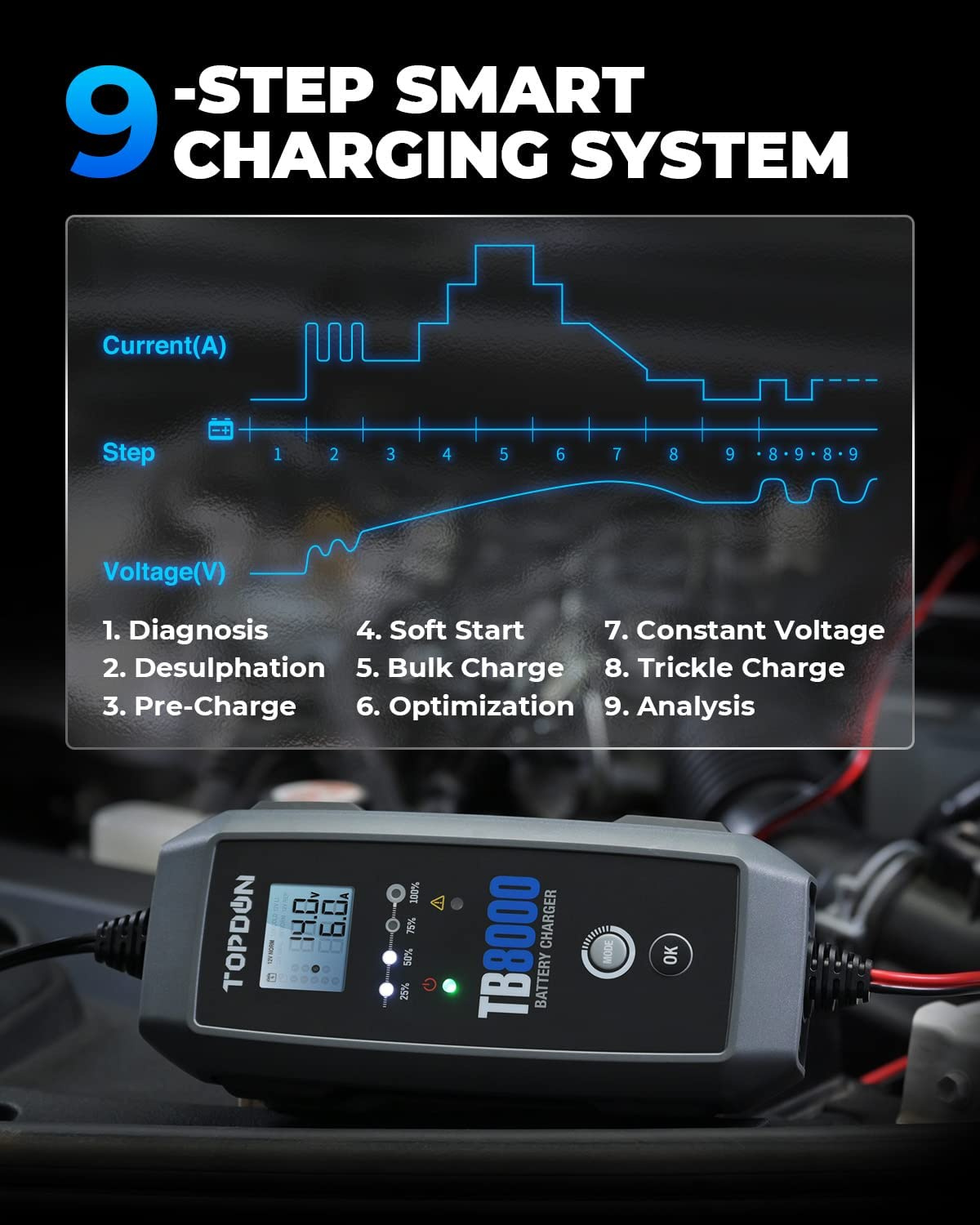 9stupňový systém inteligentního nabíjení TB8000 poskytuje uživatelům špičkovou technologii, která automaticky identifikuje stav baterie a dodává nejvhodnější proud. S tímto zařízením se již nemusíte obávat poškození baterií!