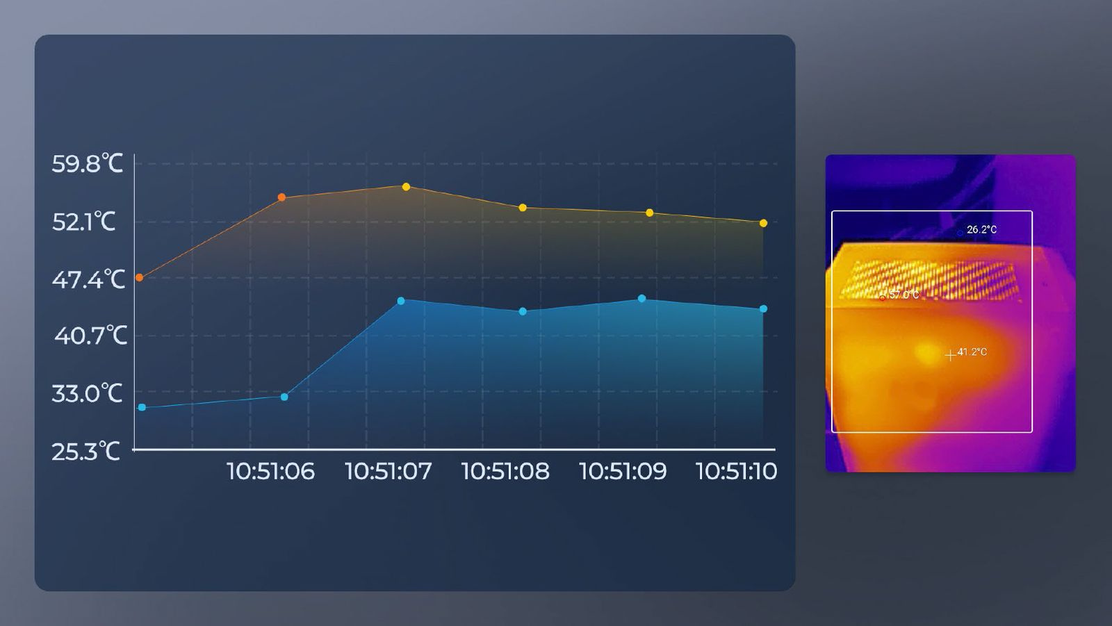 Termokamera TC002 dokáže nepřetržitě měřit teplotu a ukládat data do doprovodné aplikace. Tato data lze poté použít k výpočtu vysoké, nízké a průměrné teploty objektů v jeho zorném poli za určité časové období, což uživatelům umožňuje vizualizovat data ve formě grafu průběhu.