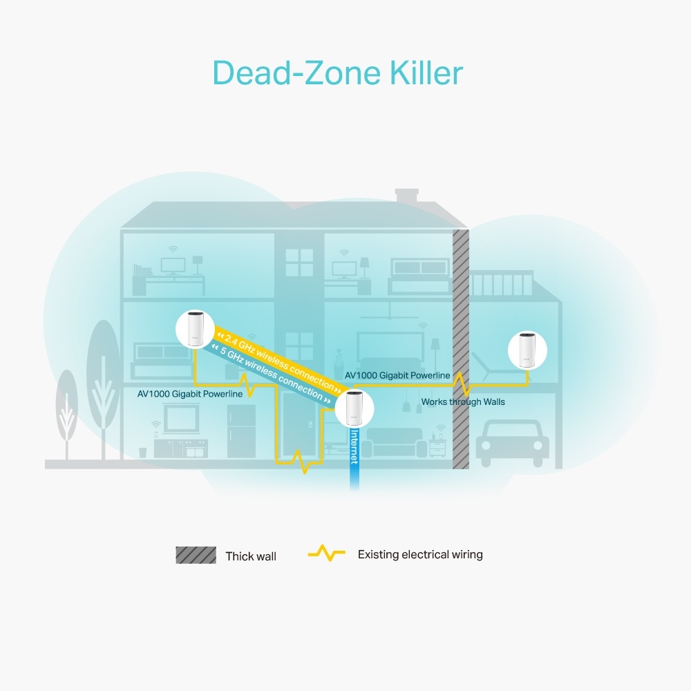 Hybridní systém pro celý dům poskytuje rozšířené pokrytí až do plochy 4 000 čtverečních stop / 370 m2 s pomocí kombinace dvou pásem Wi-Fi a elektrického vedení. Eliminujte oblasti se slabým signálem v celé domácnosti pomocí Wi-Fi a již nemusíte hledat stabilní připojení.