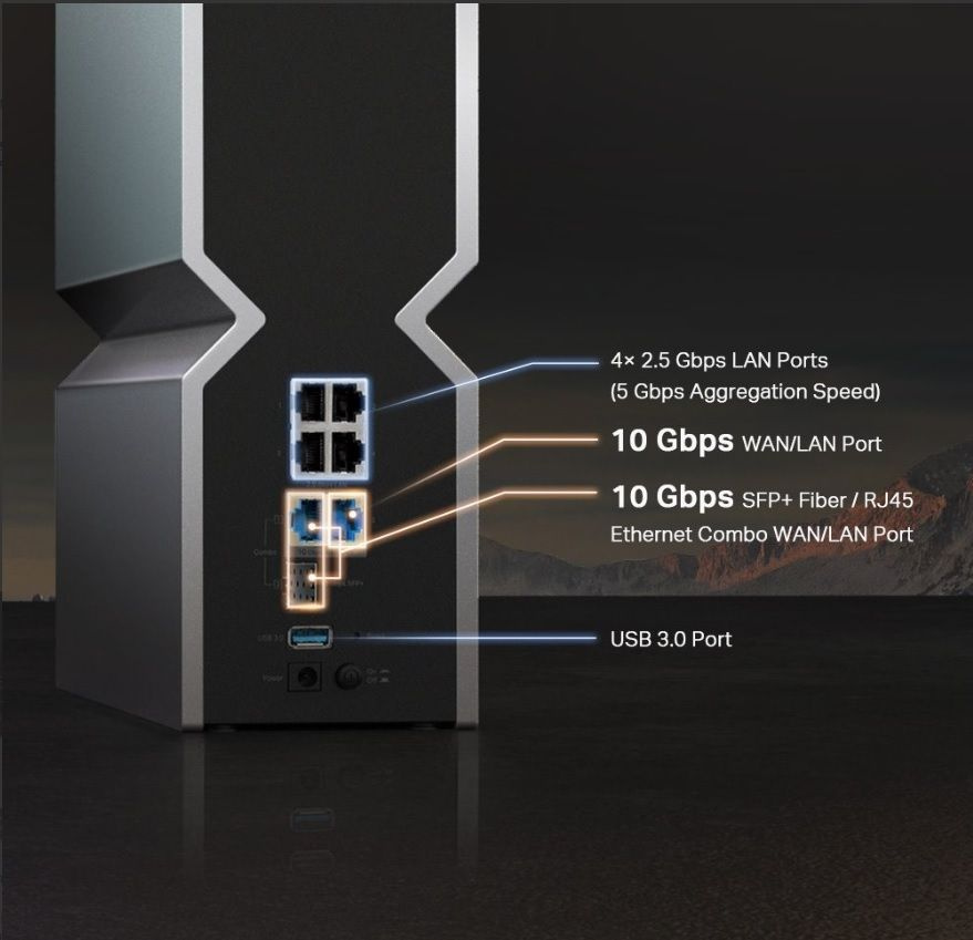 Ethernet porty: 1x 10 Gpbs WAN/LAN, 1x 10 Gbps SFP+/RJ45 Combo WAN/LAN, 4x 2,4 Gbps LAN