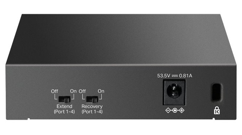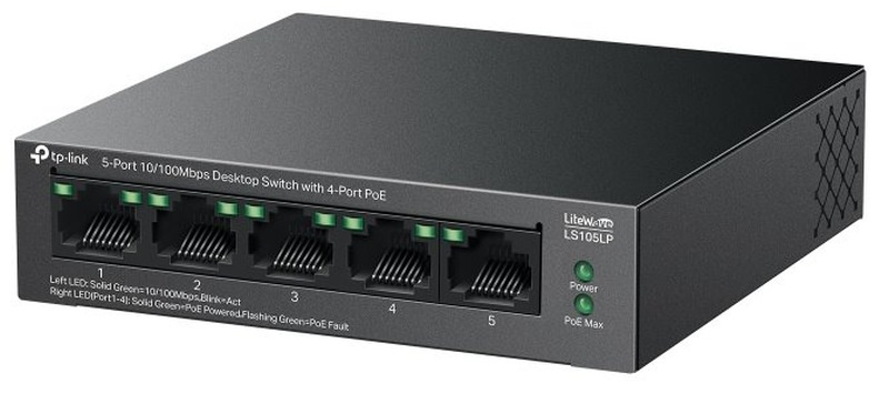 TP-Link PoE Switch LS105LP je nemanagovatelný PoE Switch s 5x 10/100Mbps LAN porty z čehož na 4 portech podporuje PoE 802.3af až 15,4W/port. Celkový PoE budget switche je 41W. Switch umožňuje i PoE na vzdálenost 250m při přepnutí speciálního přepínače, který způsobí ponížení linkové rychlosti na PoE portech na 10Mbps, což pro přenos obrazu z kamer bohatě stačí. Další funkcí je PoE auto recovery, která automaticky restartuje nereagující zařízení napájená pomocí PoE.