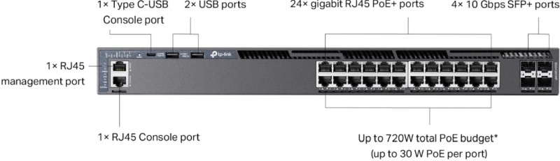 Omada SG6428XHP je pokročilý L3 managovatelný PoE+ switch. Byl vytvořen s funkcemi jako jsou L3 routing, bleskurychlé optické připojení 10 Gb/s, stohování a redundantní napájení zdroje. Zařízení nabízí působivý 720 W PoE budget, 24 gigabitových RJ45 PoE+ portů, 4x 10 Gbps SFP+ sloty a fyzické stohování. V kombinaci s centrální správou, bezpečností a komplexními funkcemi je ideální síťové řešení pro SMB, enterprise a ISP.