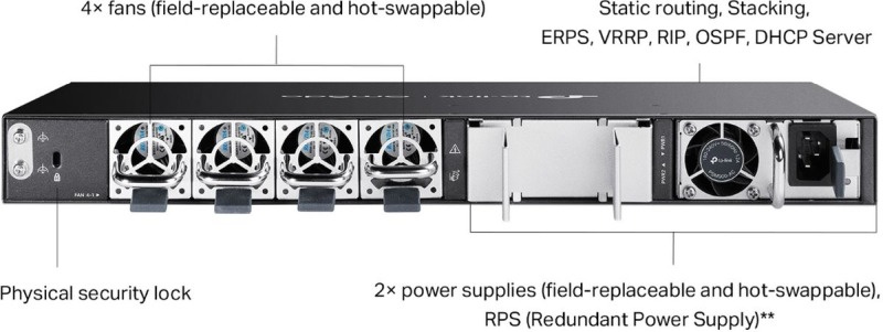 Vysoká dostupnost se 2 napájecími zdroji vyměnitelnými na místě, VRRP a ERPS
