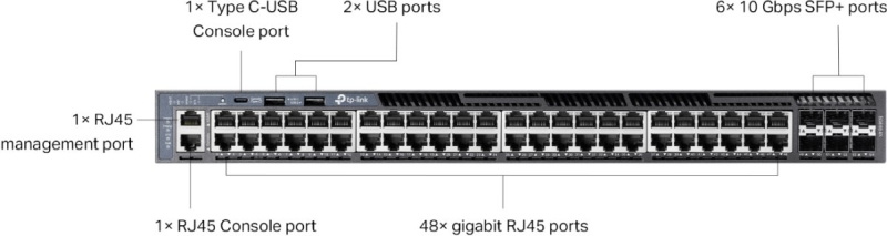 48 gigabitových RJ45 portů a 6× 10 Gbps SFP+ slotů