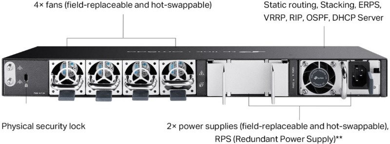 Vysoká dostupnost se 2 napájecími zdroji vyměnitelnými na místě, VRRP a ERPS