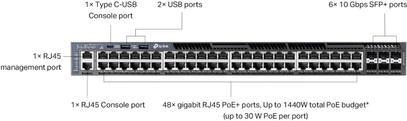 TP-Link SG6654XHP Omada 48-Portový Gigabitový Stackable L3 PoE+ Switch,48× Gigabit RJ45 PoE+ porty,6× 10 Gbps SFP+ sloty