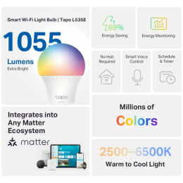 Tapo L535E je stmívatelná žárovka s paticí E27 disponující 16 miliony barvami a chytrými funkcemi. Díky světelnému toku 1055 lm a vyzařovacímu úhlu 220° dokáže nahradit klasickou žárovku s příkonem 75W a to se spotřebou pouhých 8.6 W! Udávaná životnost žárovky činí 25 000 hodin. Kromě standardního bílého světla o teplotě 2500-6500K dokáže žárovka svítit různými barvami díky diodám RGB.
