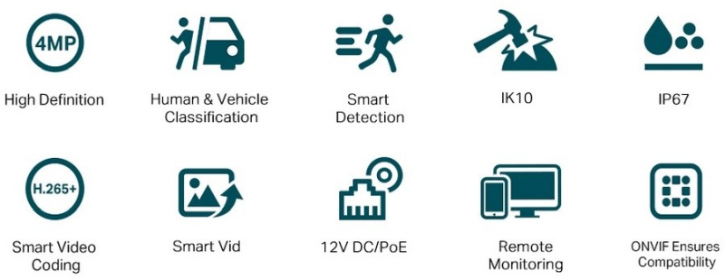 VIGI C240I(4mm) je základní 4 megapixelová Dome kamera značky TP-Link určená pro venkovní použití s fixním objektivem 4 mm, IR přísvitem do 30m vzdálenosti a ethernetovým portem s 802.3af PoE. Kamera má max. rozlišení 2560 × 1440 px (při 30 fps), pozorovací úhel 75°, 2 nezávislé streamy, digitální WDR snímač, krytí IP67 proti vodě, antivandal ochranu IK10, podporu ONVIF, kodeku H.264(+) a H.265(+).