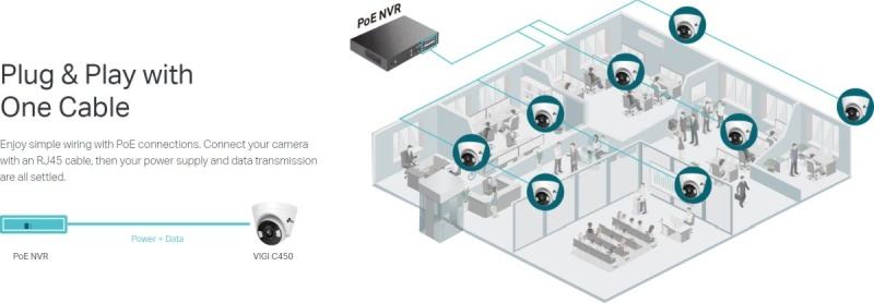 VIGI C450(4mm) je 5 MP vnitřní Turret kamera značky TP-Link s fixním objektivem 4 mm, bílým světlem a IR přísvitem do vzdálenosti 30 m a ethernetovým portem s podporou PoE. Kamera má max. rozlišení 2880 × 1620 px (při 30 fps), pozorovací úhel 90°, 2 nezávislé streamy, digitální WDR snímač, obousměrné audio (mikrofon i reproduktor), slot na microSD kartu, podporu ONVIF a kodeku H.264(+) včetně H.265(+). Kamera díky větší citlivosti podporuje tzv. Full-Color barevný obraz během celé noci.