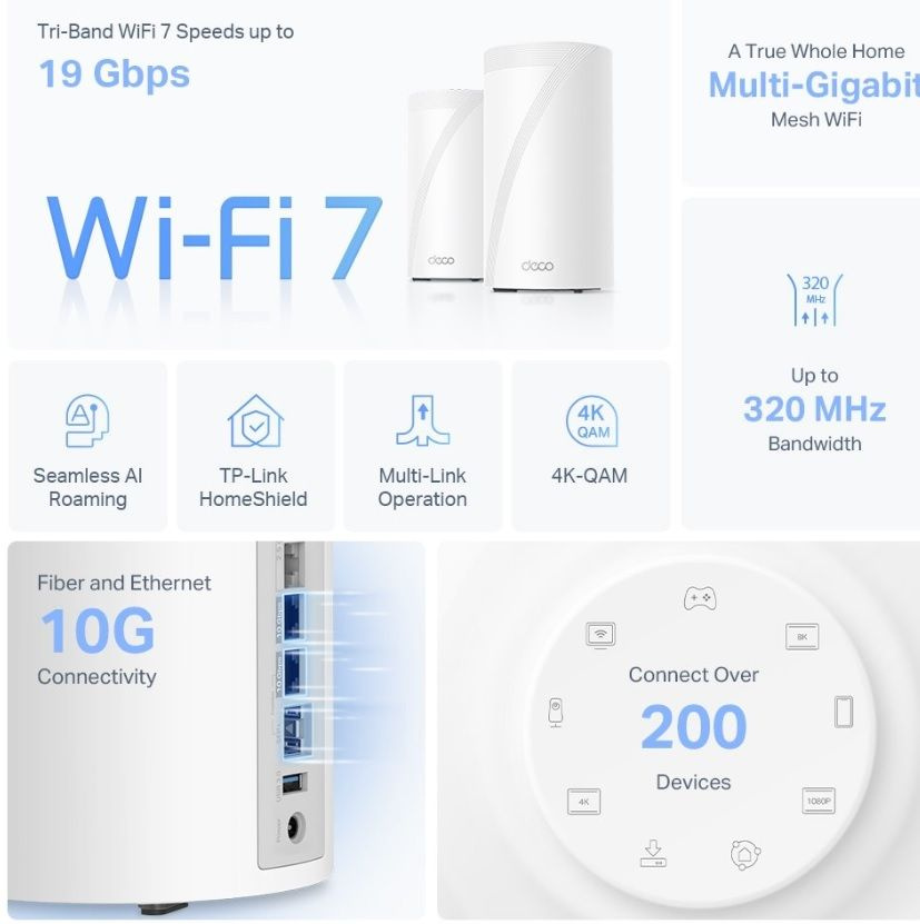 Router vám poskytne zrychlenou propustnost, vysoký výkon, nízkou latenci a silnou ochranu proti rušení. Je totiž vybavený technologií WiFi 7. Využívejte všechna tři pásma systému Whole Home WiFi 7 Mesh a dosáhněte rychlosti až 19 Gbps. Dopřejete si špičkový výkon bez přetížení sítě.
