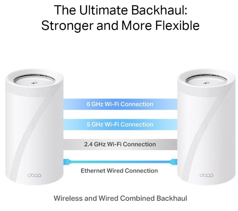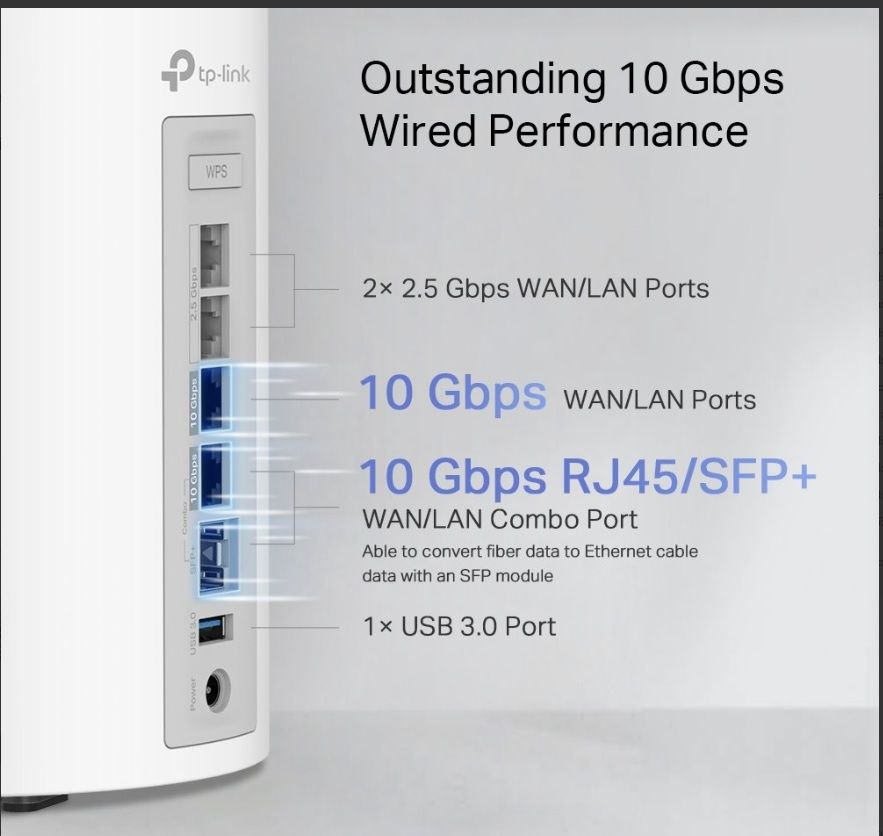 Ethernet porty: 1x 10 Gbps, 1x 10 Gbps SFP+/RJ45 Combo, 2x 2,5 Gbps (na jednu jednotku Deco)