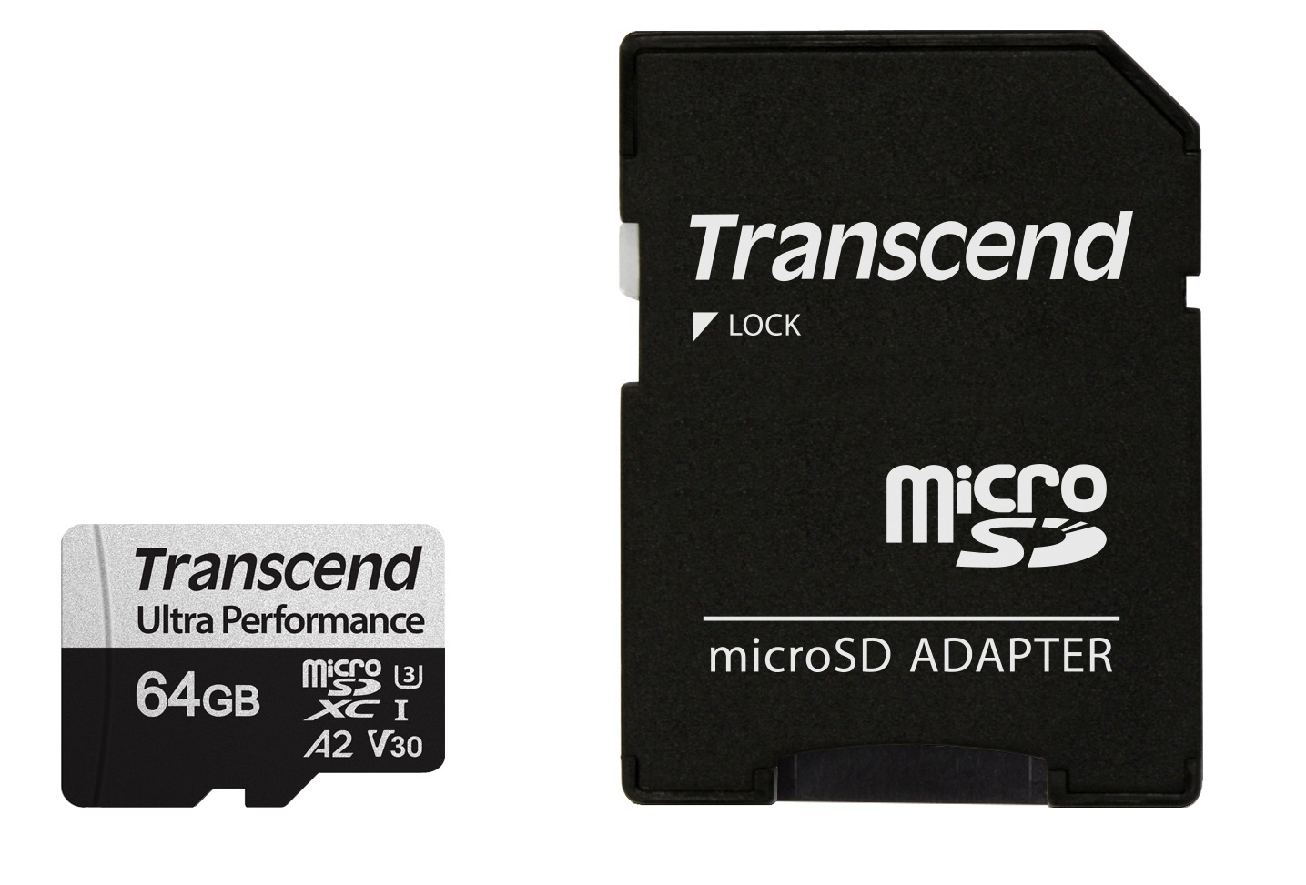 Transcend 64GB microSDXC 340S UHS-I U3 V30 A2 3D TLC (Class 10) paměťová karta (s adaptérem), 160MB/s R, 80MB/s W