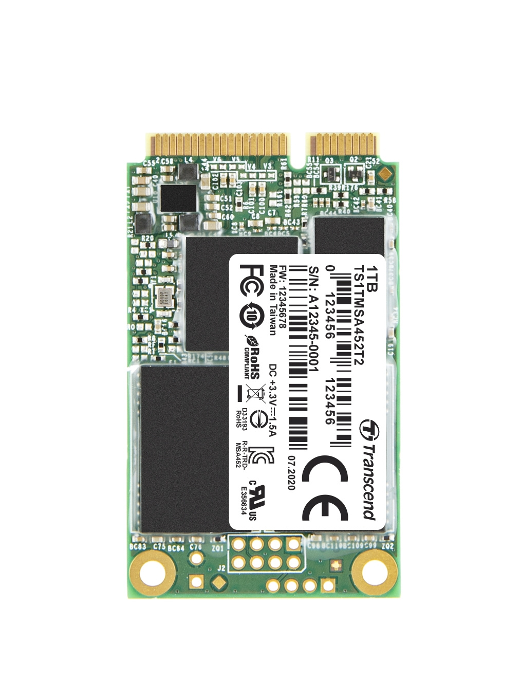 Featuring the Serial ATA interface and built around a powerful controller, Transcend's SATA III 6Gb/s MSA452T2 mSATA SSD delivers blazing-fast performance. The MSA452T2 features the latest 3D NAND technology for high storage efficiency, 30µ" PCB gold finger and Corner Bond technology for enhanced durability, built-in DRAM cache for fast access, an extended operating temperature range from -20°C to 75°C, and an endurance rating of 3K Program/Erase cycles for reliable operation. The compact mSATA form factor is just one-eighth the size of a standard 2.5" SSD, making it perfect for use in space-constricted portable devices such as Ultrabooks, tablet PCs, and slim servers.