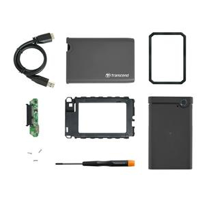 Transcend's 2.5” SSD/HDD Enclosure Kit includes a 2.5-inch enclosure with an outer rubber case, an inner rubber shock absorber, a SATA adapter, a USB cable, a 7mm to 9.5mm spacer, a PH1 screwdriver, and three M2 mounting screws.