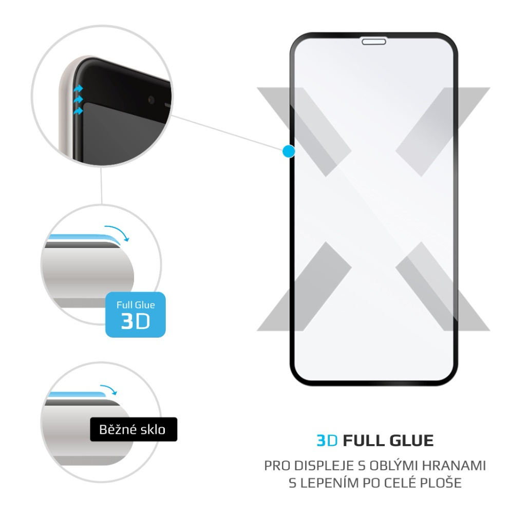- Upozornění: 3D skla kryjí kompletně celou přední část displeje včetně zaoblených rohů a může dojít k tomu, že telefon pak nebude stoprocentně kompatibilní s některými typy zadních krytů nebo pouzder