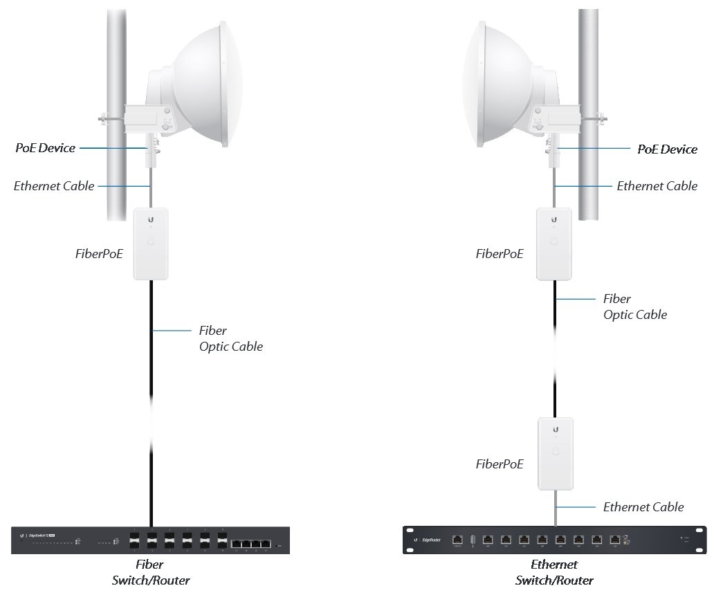 Ubiquiti FiberPOE je cenově dostupný, gigabitový, opticko-metalický, venkovní konvertor, jenž kromě převodu dat z optického vlákna na metalický kabel umí také napájení pomocí PoE.