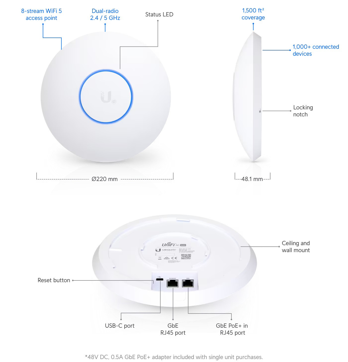 Zařízení je součástí kompletní řady výrobků UniFi, podporuje standardy 802.11a/g/b/n/ac/ac-wave2, kdy používá jak pásmo 2,4GHz, tak i 5GHz. K podpoření výkonu bezdrátové části je UAP vybaveno dvěma Gbit ethernetovými porty, které jsou kompatibilní se standardem 802.3at PoE+. Maximální výkon rádiové části je 25dBm v obou pásmech, podpořený čtveřicí antén s 6dBi ziskem. Šifrování pomocí WPA2 je dnes již samozřejmostí. UAP je možné instalovat na stejný držák jako UAP-AC-PRO, v případě upgradu sítě tak není potřeba složitě vyměňovat úchyty pro zařízení.