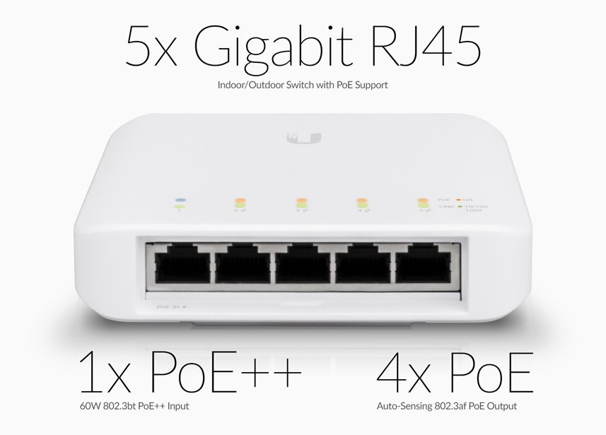 USW-Flex-Mini je maličký 5-portový Gigabitový switch se správou přes UniFi Controller od Ubiquiti Networks v desktop provedení s prvním portem podporující PoE In.