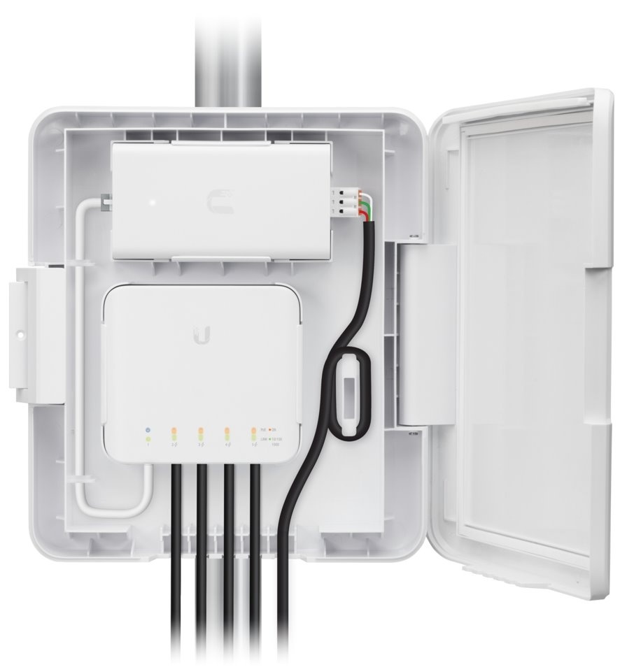 USW-Flex-Utility je venkovní krabice odolná proti povětrnostním vlivům speciálně navržená pro použití s UniFi Switch Flex (USW-Flex) zařízením.
