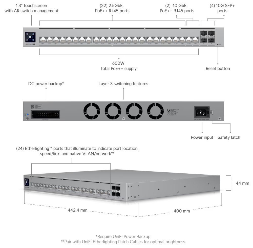 UniFi Switch (USW-Pro-HD-24) je spolehlivý L3 switch s managementem v profesionálním provedení určený pro montáž do racku 1U.