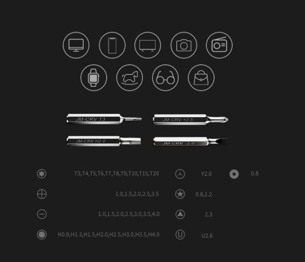 Sada nářadí pro opravu RC modelůRuční stopka je vyrobena hlavně ze slitiny hliníku, trvanlivá a lehká. Automaticky převrátit design, pohodlně vymýtit příslušenství a přenosný. Vhodné pro notebooky, chytré telefony a tablety. Různé druhy šroubováků, spokojené s různými požadavky. Bity jsou vyrobeny z 6150 CR-V po kalení a jasném chromování, trvanlivé a spolehlivéBalení obsahuje:36 x CR-V Bits:Screwdriver Set (Torx: T3, T4, T5, T6, T7, T8, T9, T10, T15, T20Ostatní: H0.9, H1.3, H1.5, H2.0, H2.5, H3.0, H3.5, H4.0Přímý: 1,0, 1,5, 2,0, 2,5, 3,0 3,5, 4,0Philips: 1,0, 1,5, 2,0, 2,5, 3,5Trojúhelník: 2,3Y tvar: Y2,0Pětihvězdičková: 0,8, 1,2 UTvarovaná: U2,6 Bod: 0,8) 1 x rukojeť z hliníkové slitiny1 x prodlužovací tyč