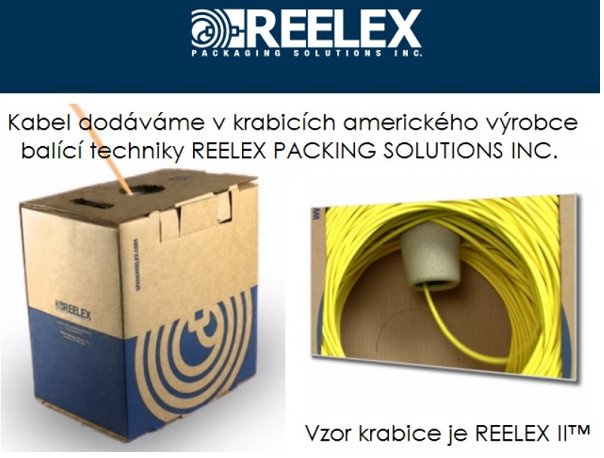 kabel je dodáván v krabici REELEX II amerického výrobce obalů REELEX Packaging Solutions, Inc.