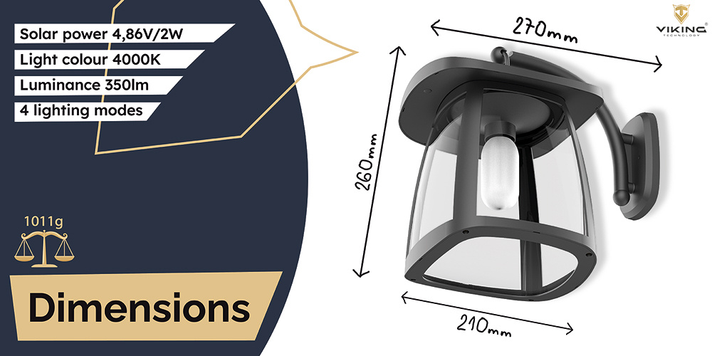 Použitý monokrystalický solární panel disponuje výkonem 4,86 V/2 W. Pokud venku panují nevhodné podmínky, světlo Viking SR10W dokáže fungovat až 10 dní.