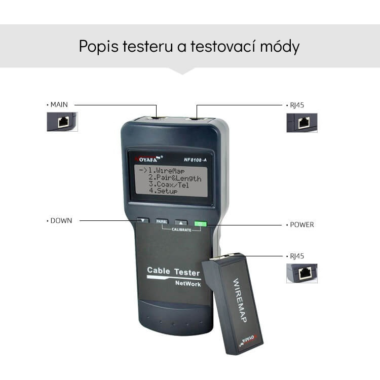 Profesionální tester UTP kabelů NF8108A, RJ45 s podsvíceným LCD displejem a vzdáleným měřícím modulem.