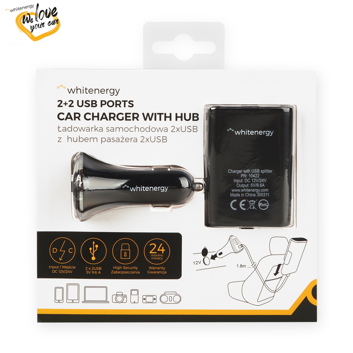 WE auto adaptér 2x + 2x USB 5V 9.6A 1.8m