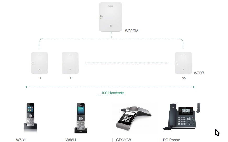Multi-cell systém Yealink W80 IP DECT podporuje propojení jednoho W80DM DECT manageru a až 30 W80B základnových stanic. Tento systém podporuje registraci až 100 koncových zařízení W53H, W56H, CP930W a DD telefonů (T41S + DD10K).