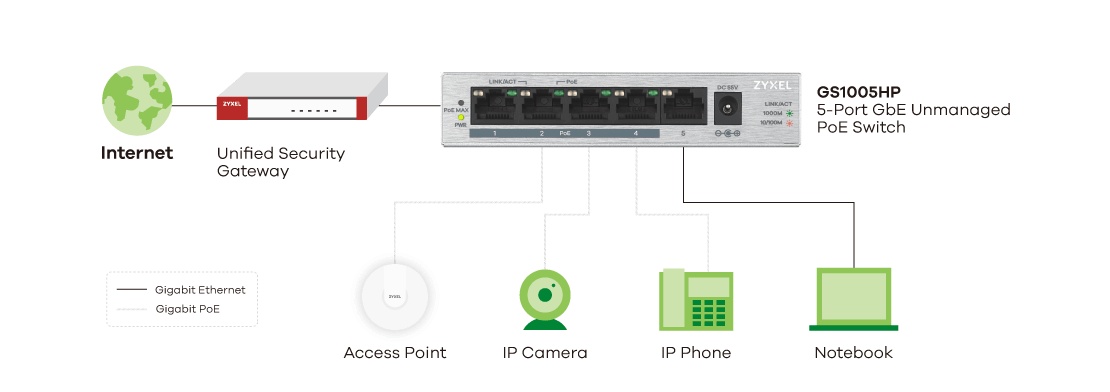 The Zyxel GS1005HP is equipped with 5 gigabit Ethernet ports, 4 of which are PoE ports that can deliver up to 60W of total PoE budget. The GS1005HP can easily connect with PoE ready devices to your network with plug-and-play design while providing power-saving benefits without compromising performance. The GS1005HP fills a long-standing hole in the market for unmanaged PoE switches that feature the 802.3at standard, has a high power budget and are affordable for SOHOs and small businesses.