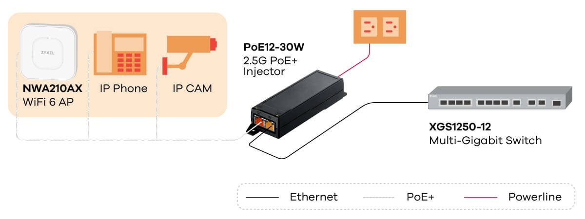 PoE12-30W je vícegigabitový injektor PoE podporující síťovou rychlost až 2,5 Gb/s. Umožňuje připojit napájená zařízení prostřednictvím stávajícího kabelu Cat 5e nebo vyššího.